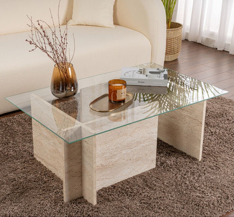 169,95Grundpreis /Nicht verfügbarRechteckiger Moderner Couchtisch Vetroni Travertin Look - Glas - 105x65 cm