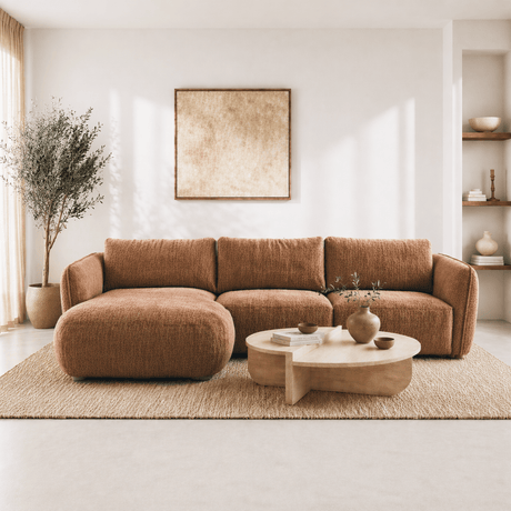 Ecksofa mit kupferfarbenem Chenille-Stoffbezug, Modell Shane - links