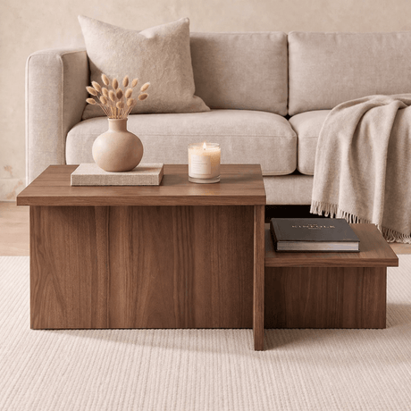 Couchtisch Set von 2 Jimi Travertinplatte mit Walnussgestell