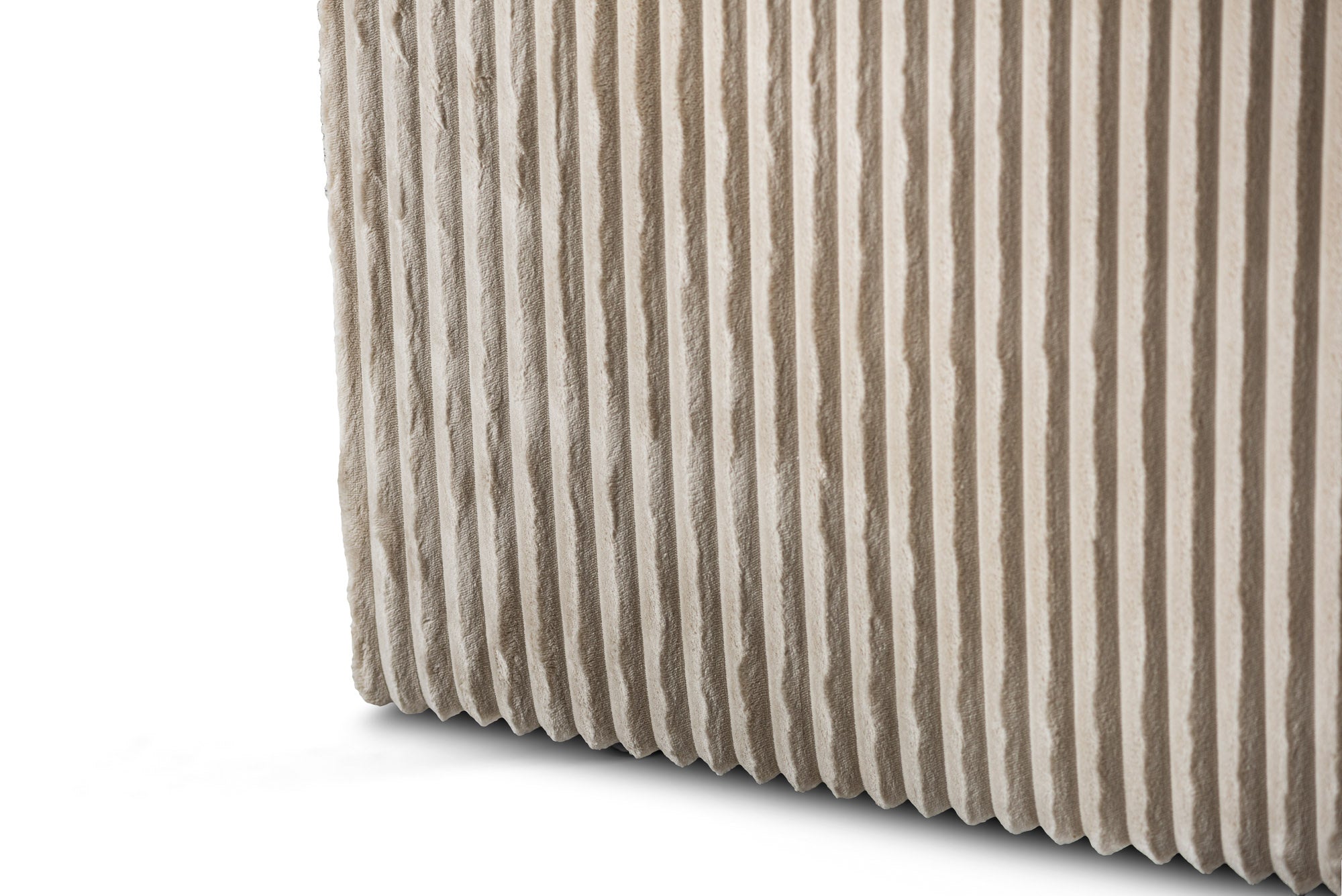 Die runde Chaiselongue kann links oder rechts platziert werden und sorgt für ein modernes und skandinavisches Design, sodass dieses Ecksofa perfekt in eine moderne Einrichtung passt. Der gerippte Stoff in der trendigen Farbe Beige verleiht dem Sofa ein luxuriöses Aussehen und fühlt sich zudem weich und bequem an.