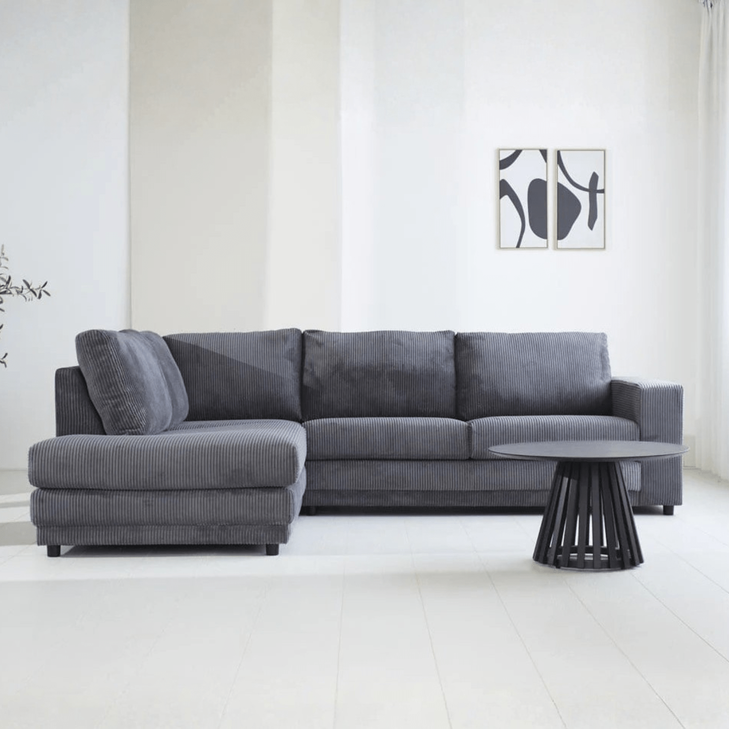 Das moderne Ecksofa Gabi ist aus Cordstoff gefertigt und hat Metallfüße. Dieses strapazierfähige Ecksofa bietet dank der breiten und weichen Kissen einen komfortablen Sitz. Komfortabel entspannen nach einem langen Arbeitstag? Wählen Sie das Ecksofa Gabi!