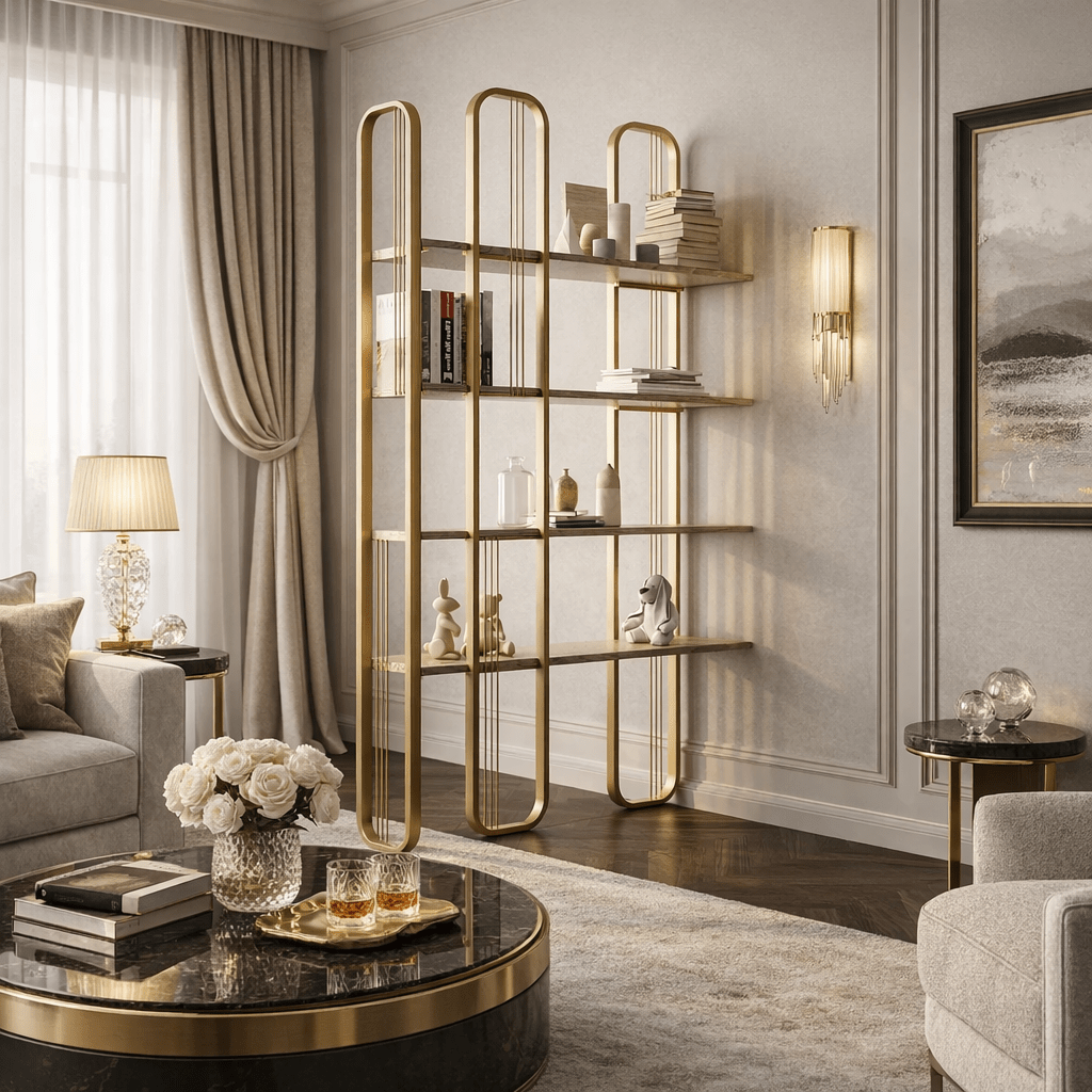 Lerne unser wunderschönes barockes Glam Bücherregal kennen, ein Meisterwerk, das deinen Wohnraum auf neue Höhen der Raffinesse heben wird. Dieses wunderschöne Möbelstück ist nicht nur ein Bücherregal, sondern ein Kunstwerk, das deine Sinne verzaubern und einen bleibenden Eindruck bei jedem hinterlassen wird, der es sieht.