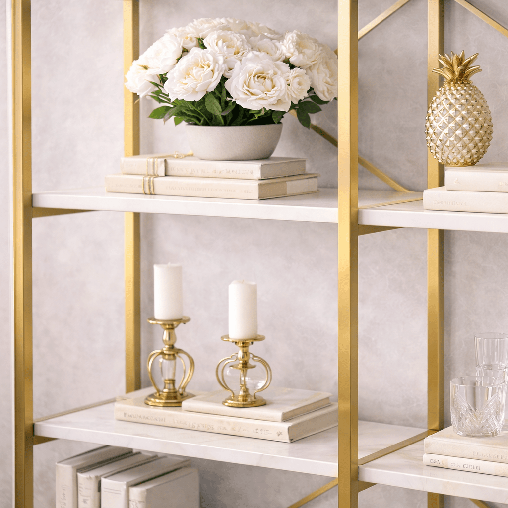 Dieses Bücherregal besteht aus 100% Melamin und ist darauf ausgelegt, lange zu halten. Die Dicke von 18 mm sorgt für außergewöhnliche Stabilität, sodass du deine Buchsammlung mit gutem Gewissen präsentieren kannst, ohne dir Sorgen über Durchhängen oder Verbiegen machen zu müssen. Das schlanke Metallgestell verleiht einen modernen Touch, während die Kombination aus weißem Marmor und goldenen Farben Eleganz und Luxus ausstrahlt.