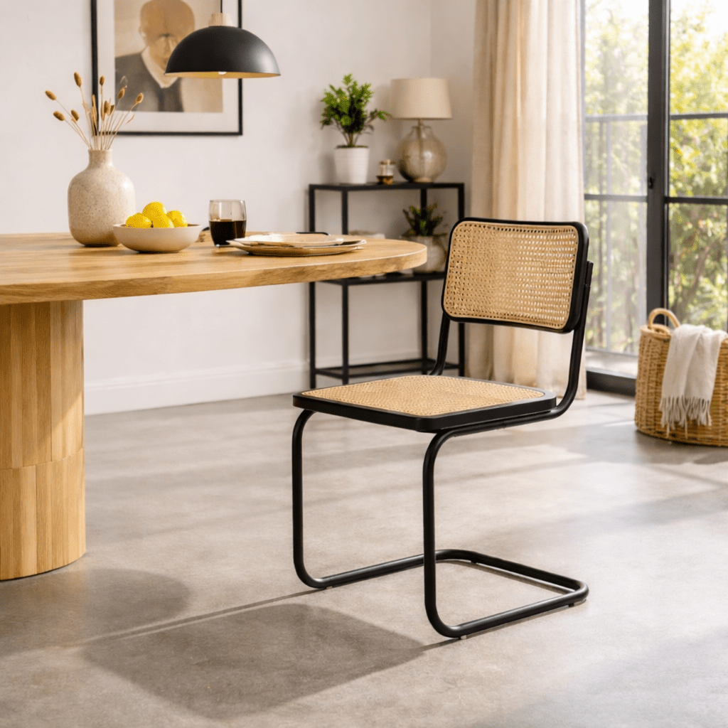 Of het nu gaat om een moderne eethoek, een zakelijke vergaderruimte of een stijlvolle werkplek; deze webbing eetkamerstoel integreert moeiteloos in uiteenlopende stijlen en settingen. Door de combinatie van natuurlijke materialen en een minimalistisch metalen onderstel vormt de stoel een visueel rustpunt. Het open karakter van het vlechtwerk behoudt de lichtinval, waardoor de ruimte een luchtige en transparante uitstraling behoudt.