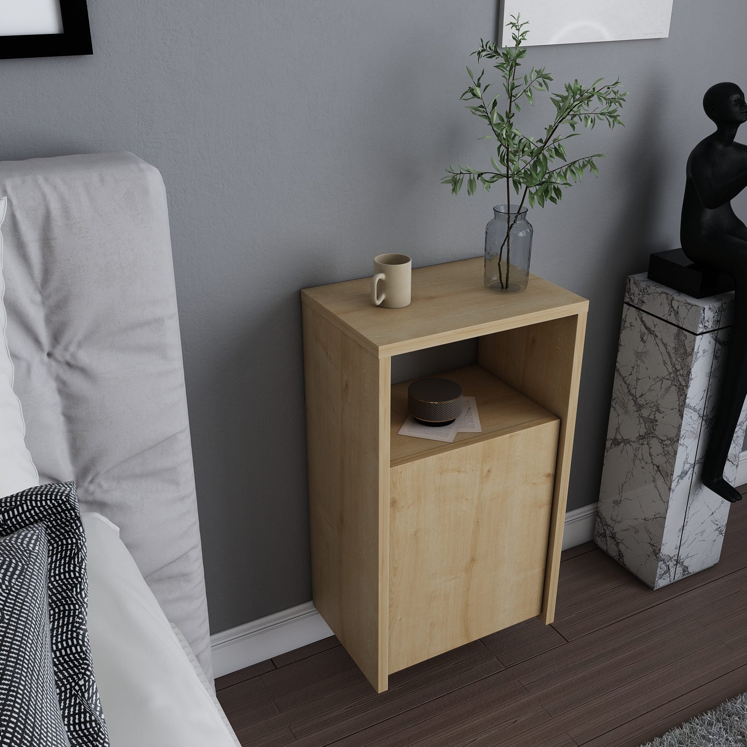 Met een lengte van 36 cm, een breedte van 25,3 cm en een hoogte van 61,4 cm is Carlin ideaal voor kleinere ruimtes of een smalle zijde naast het bed. Dankzij de hoogte heb je je essentials binnen handbereik en creëer je een verzorgde, rustige look in je slaapkamer.