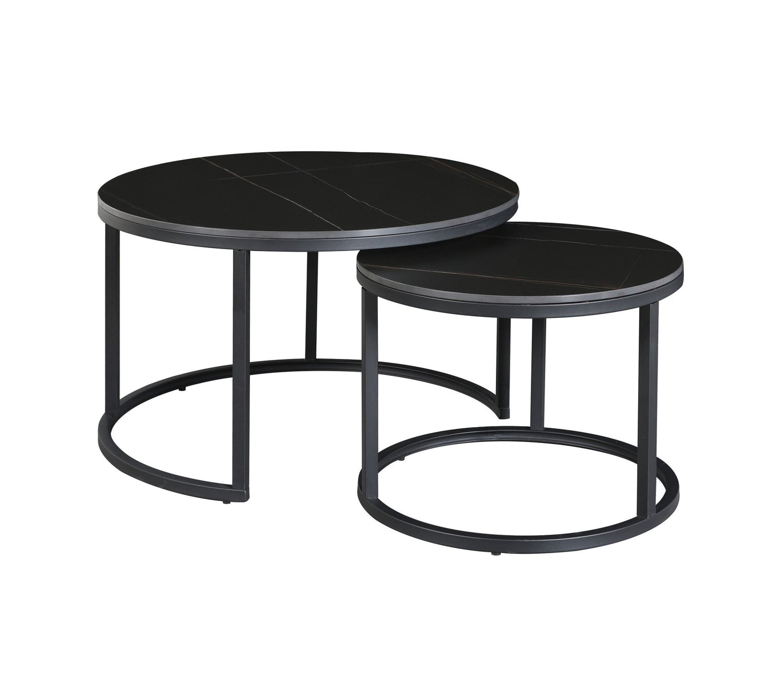 Das Gerüst des Couchtisch -Sets -Tevor -Sets besteht aus schwarzem, pulverbeschichtetem Metall und enthält eine spielerische Form. Dieses Modell muss durch ein paar Schrauben zusammengesetzt werden.