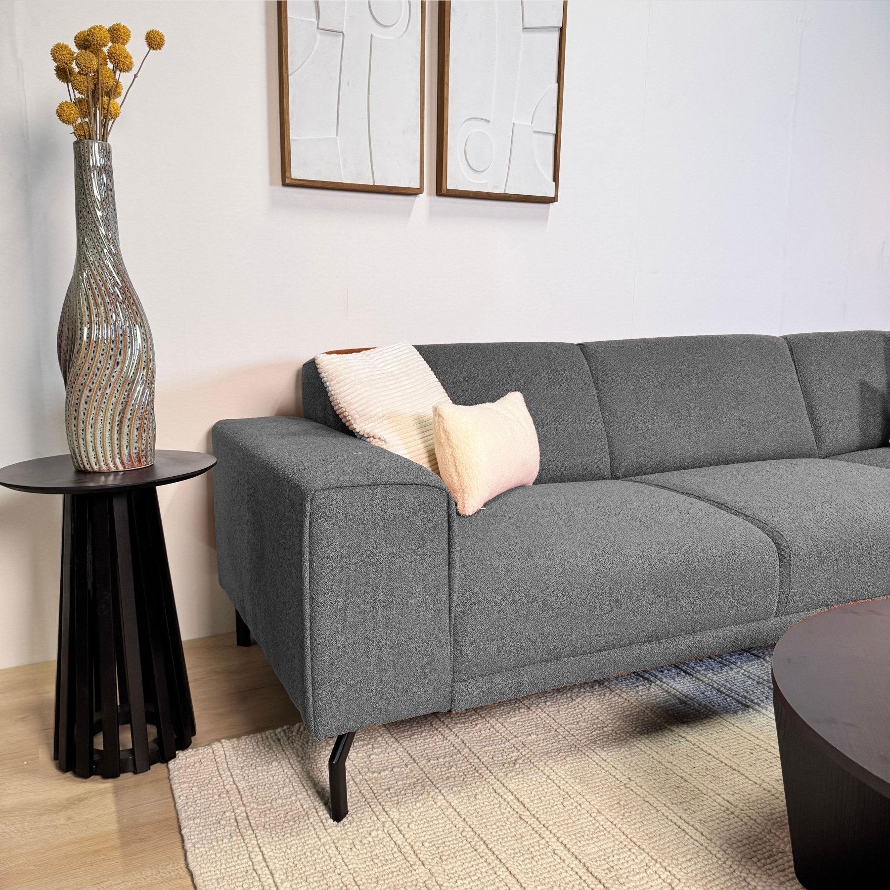 Bist du auf der Suche nach einem großen, komfortablen Ecksofa aus Bouclé-Stoff? Und möchtest du, dass dein Ecksofa zum Mittelpunkt deines Wohnzimmers wird? Dann ist das Ecksofa Maël in grauer Farbe eine ausgezeichnete Option!