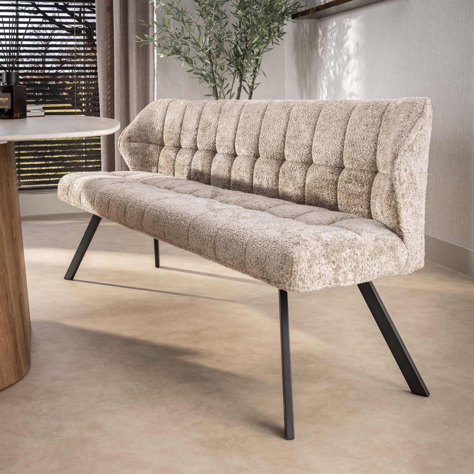 Meer zitplek, meer sfeer, minder gedoe. Met de eetkamerbank Raster in Alura zand creëer je in één keer een warme, uitnodigende eethoek. De zachte zandkleur laat zich moeiteloos combineren met hout, zwart staal en lichte tinten, terwijl de strakke lijnen zorgen voor een moderne uitstraling.