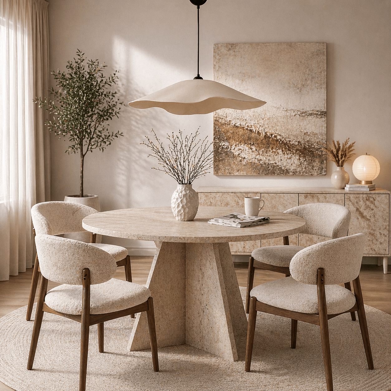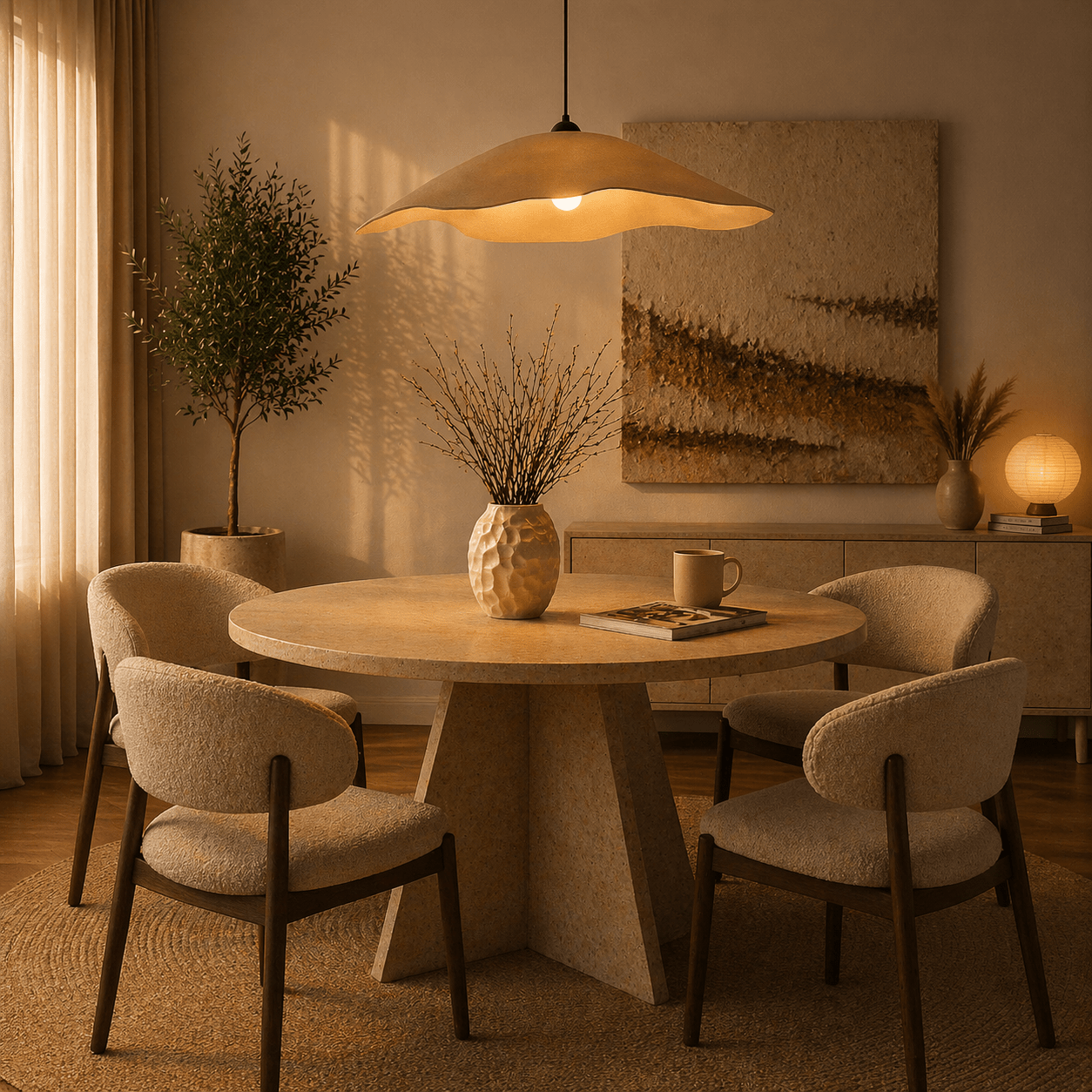 Die Kombination aus sanften Cremefarben und warmen Goldtönen schafft eine edle und friedliche Atmosphäre. Der Schirm aus Carbonbeton sorgt für einen modernen Touch und macht diese Lampe perfekt für moderne und klassische Innenräume.