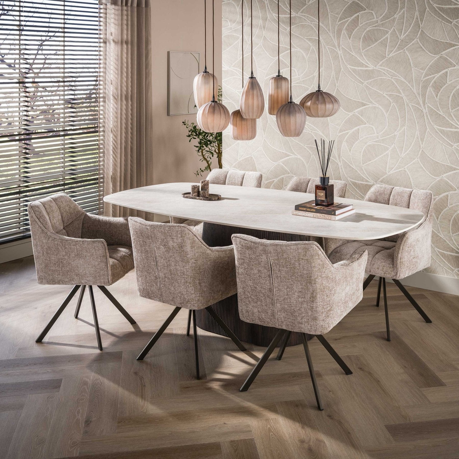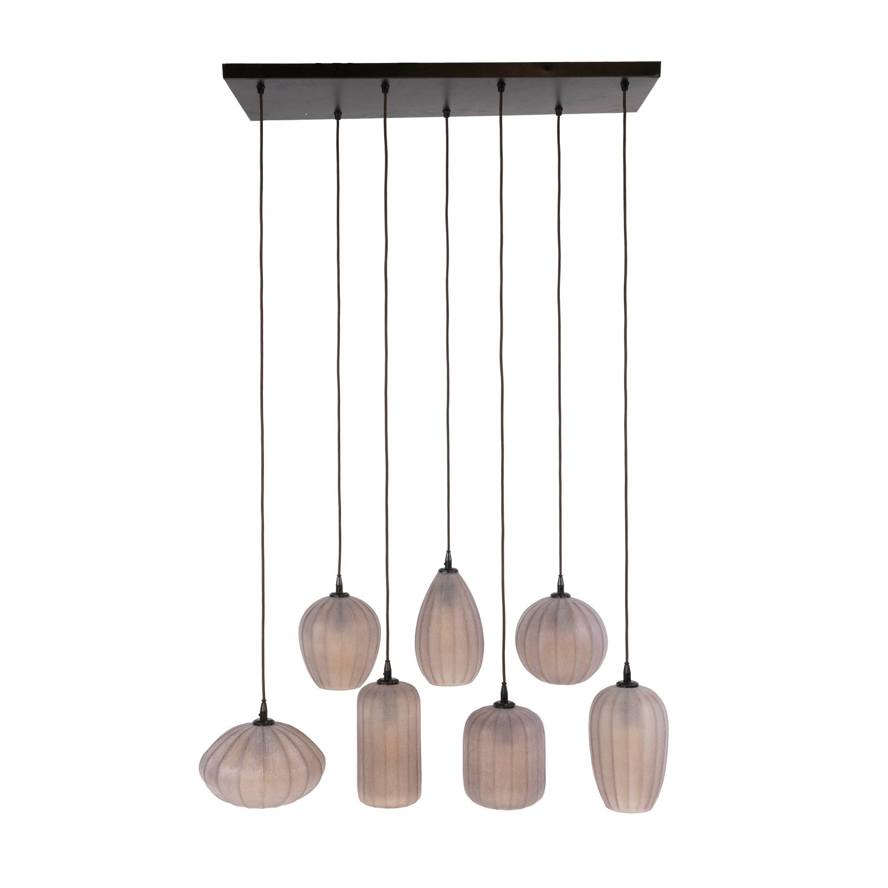 Hanglamp Arda is uitgevoerd met 7 glazen kappen in bruin frosted glas. De kappen zijn opgeschuurd, waardoor het glas gematteerd is en het licht diffuus wordt verspreid. Iedere kap is afzonderlijk in hoogte verstelbaar tot 150 cm.