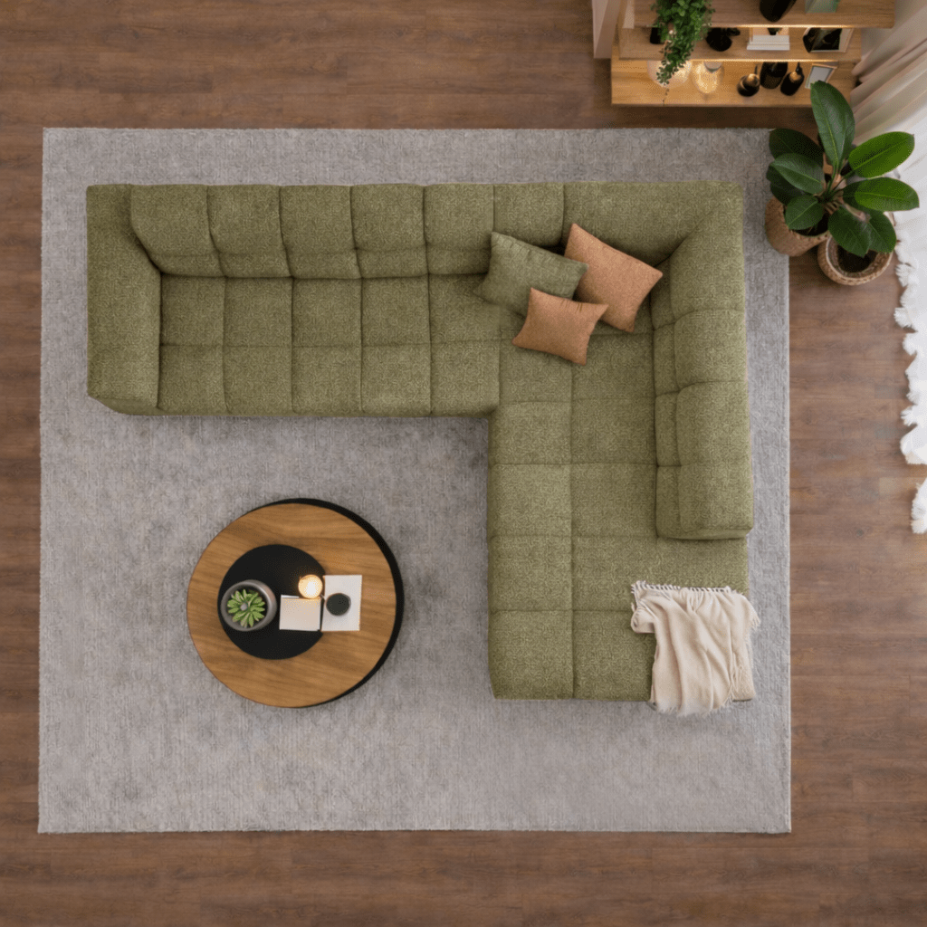 Hoekbank met lounge olijf groen bouclé stof Nova - rechts