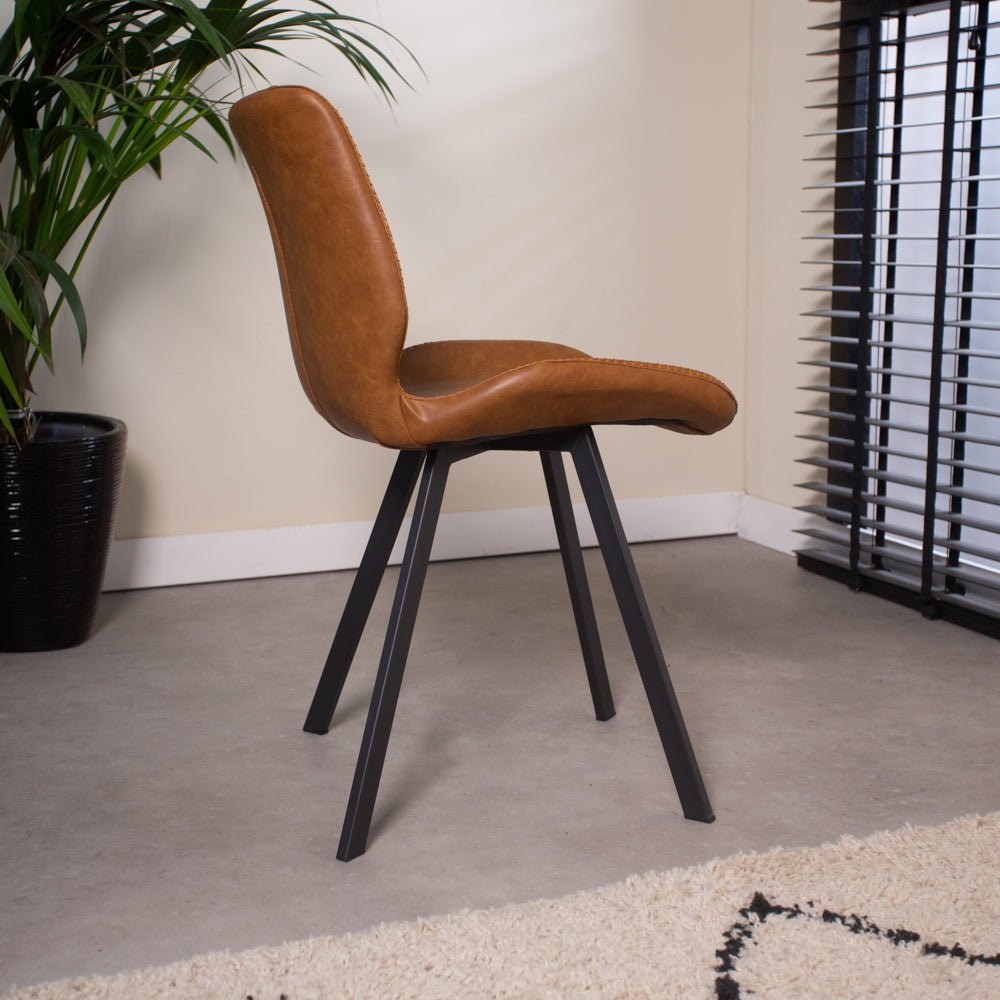 Der industrielle Esszimmerstuhl Barry cognac ist die perfekte Ergänzung für ein robustes Interieur. Mit seinem robusten Vintage-Sitz und dem schwarz pulverbeschichteten Rahmen ist er ein auffälliger Stuhl. Leicht zu kombinieren mit unseren industriellen Möbeln.