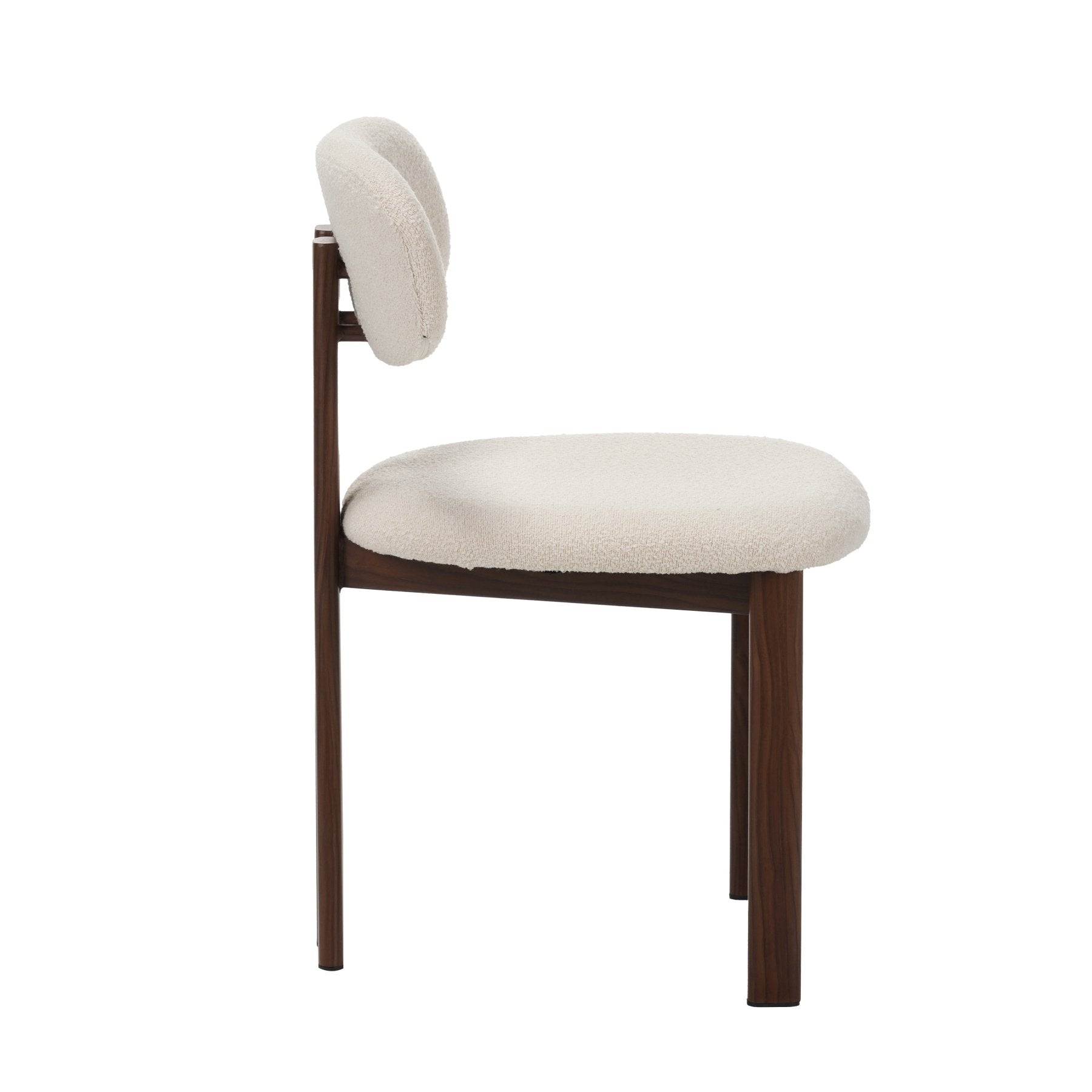 Beschreibung und Spezifikationen von Japandi Esszimmerstuhl Miyo Bouclé Elfenbein - Walnusslook Rahmen