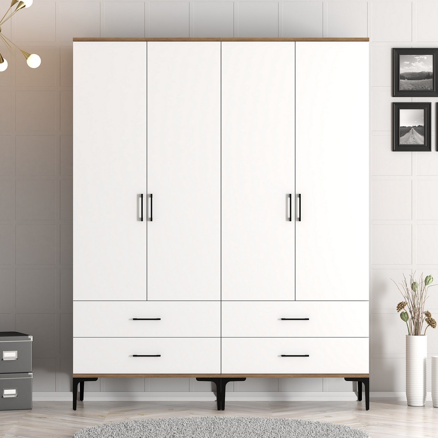 Die Kombination aus Walnuss- und Weißtönen schafft einen visuell ansprechenden Kontrast, der mühelos zu jeder Schlafzimmergestaltung passt. Das schlanke und moderne Design des Kleiderschranks verleiht deinem Raum einen Hauch von Raffinesse, während das geräumige Innere ausreichend Stauraum für deine Kleidung, Accessoires und mehr bietet.