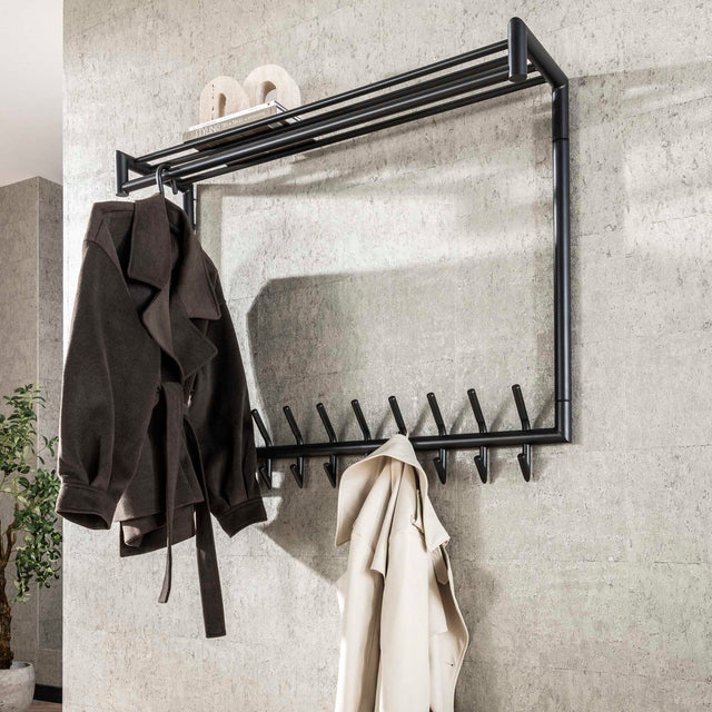 Mit insgesamt 20 geschweißten Haken und einer integrierten Stange gibt es reichlich Platz, um Jacken und Kleiderbügel ordentlich aufzubewahren. Dank der zwei Befestigungspunkte lässt sich der Kleiderständer einfach und stabil an der Wand montieren. Außerdem ist der Kleiderständer Kym vollständig zerlegbar (KD), was für eine kompakte und kostengünstige Paketgröße sorgt.