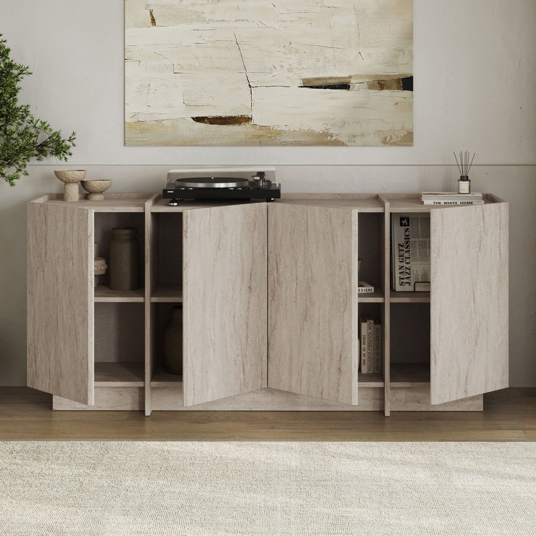 Dieses Sideboard ist aus hochwertigem Melamin in Travertin-Optik gefertigt. Dieses Material bietet die natürliche und warme Ausstrahlung von Travertin, jedoch mit den Vorteilen von Melamin: Es ist äußerst kratzfest, farbecht und sehr pflegeleicht. Ein feuchtes Tuch genügt, um Ihr Möbelstück jahrelang wie neu aussehen zu lassen.