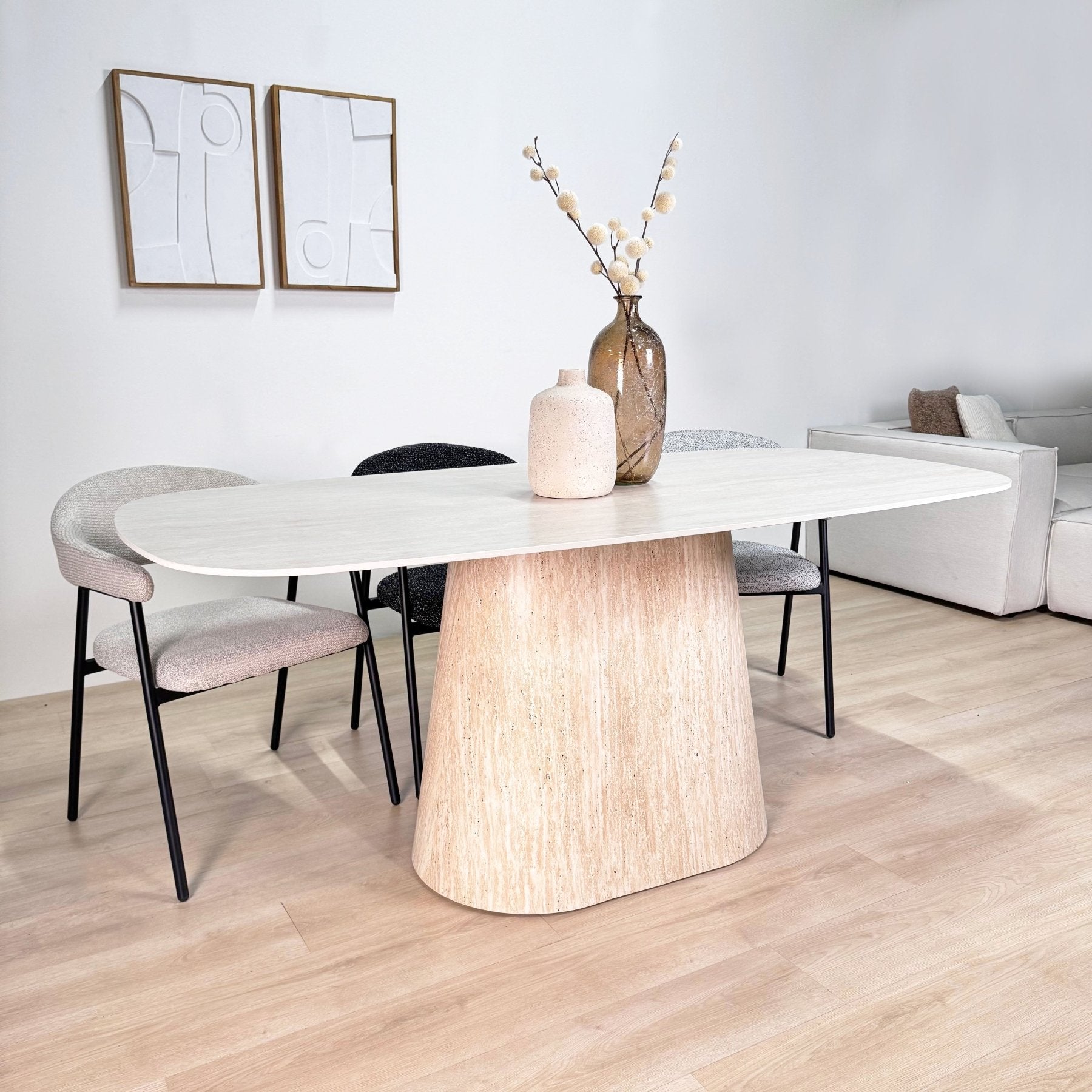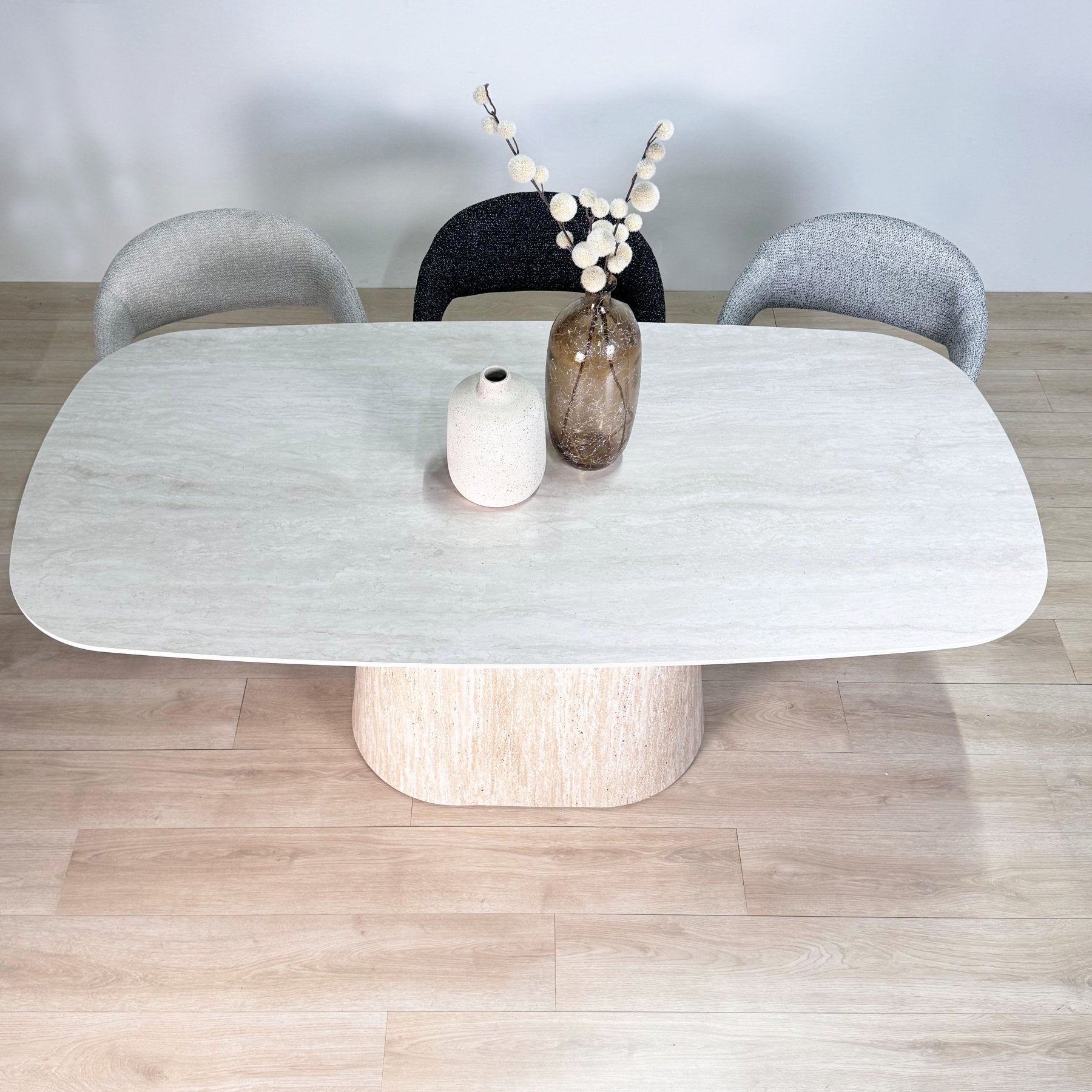 Dieser wunderschöne dänische ovale Esstisch kombiniert eine leichte Platte aus sintered stone mit Marmoroptik und subtilen Travertin-Details. Die weiche Maserung verleiht der Tischplatte eine luxuriöse, schicke Ausstrahlung, während das warme Travertin-Design des Gestells Harmonie schafft.