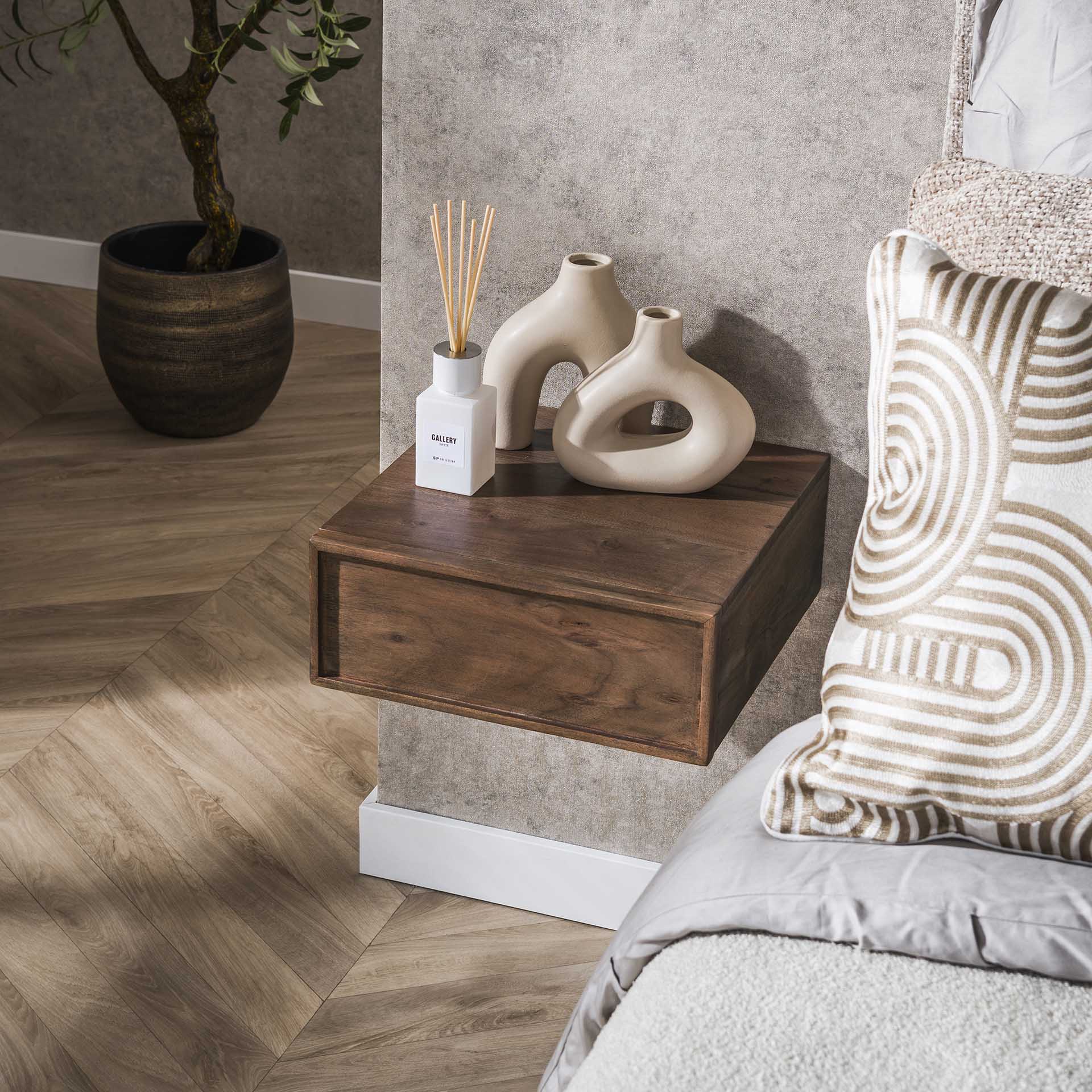 Geben Sie Ihrem Schlafzimmer ein stilvolles Upgrade mit diesem schwebenden Nachttisch aus massivem Akazienholz in Drift Brown. Das kompakte, minimalistische Design scheint an der Wand zu schweben und lässt Ihren Boden frei, was Ruhe und Raum schafft. Der warme Holzton und die natürliche Maserung sorgen für einen zeitlosen, industriellen Look, der sich mühelos mit verschiedenen Einrichtungsstilen kombinieren lässt.