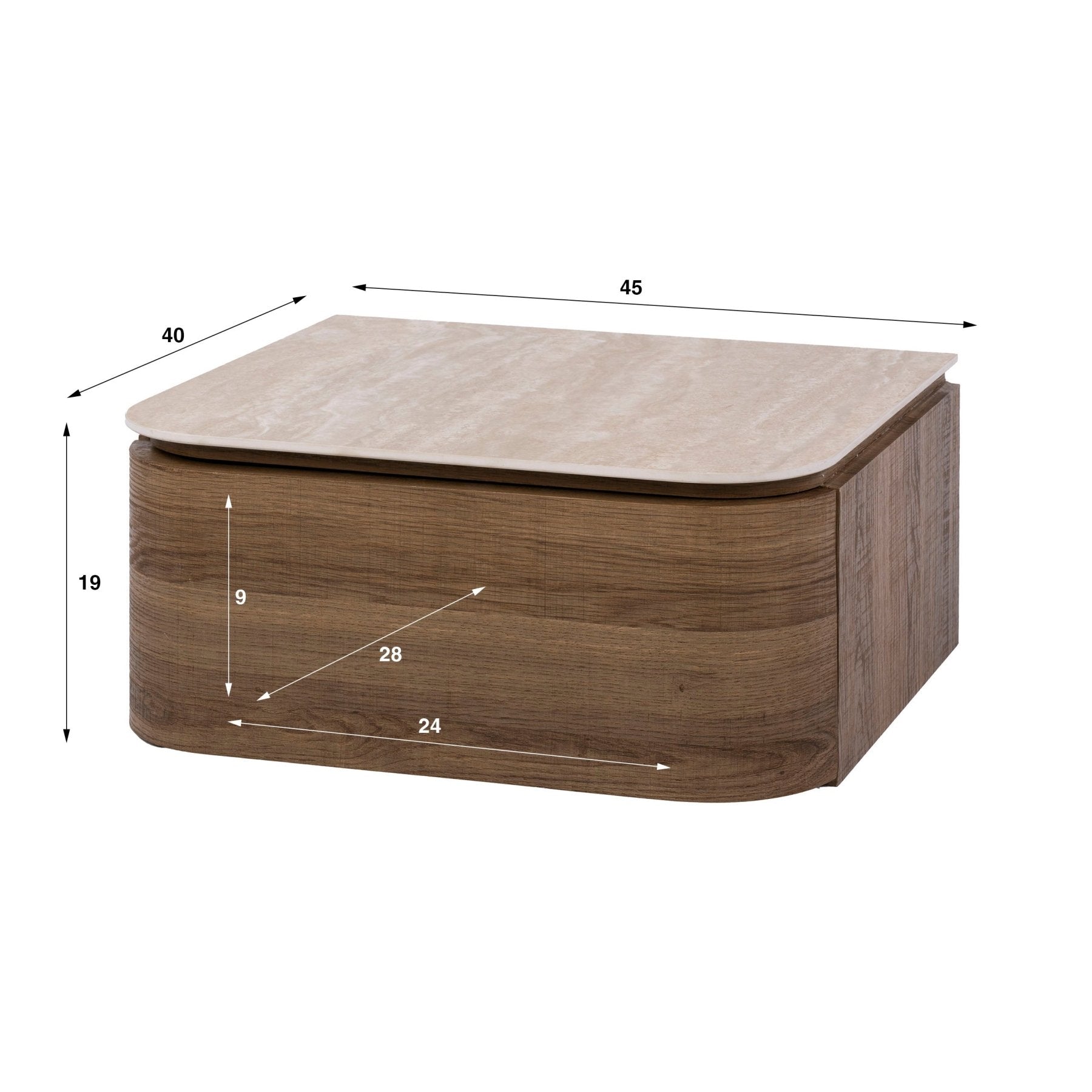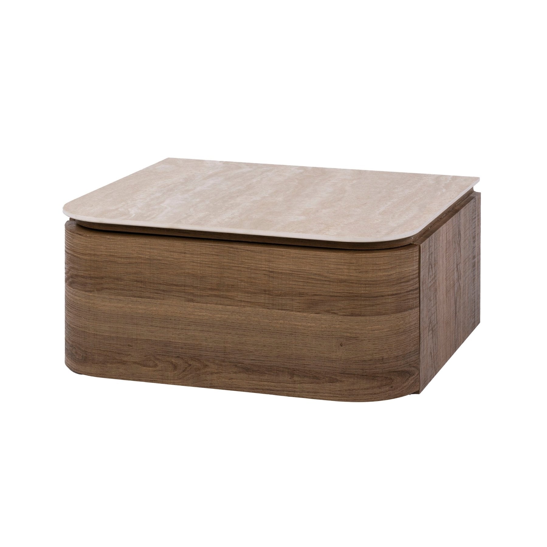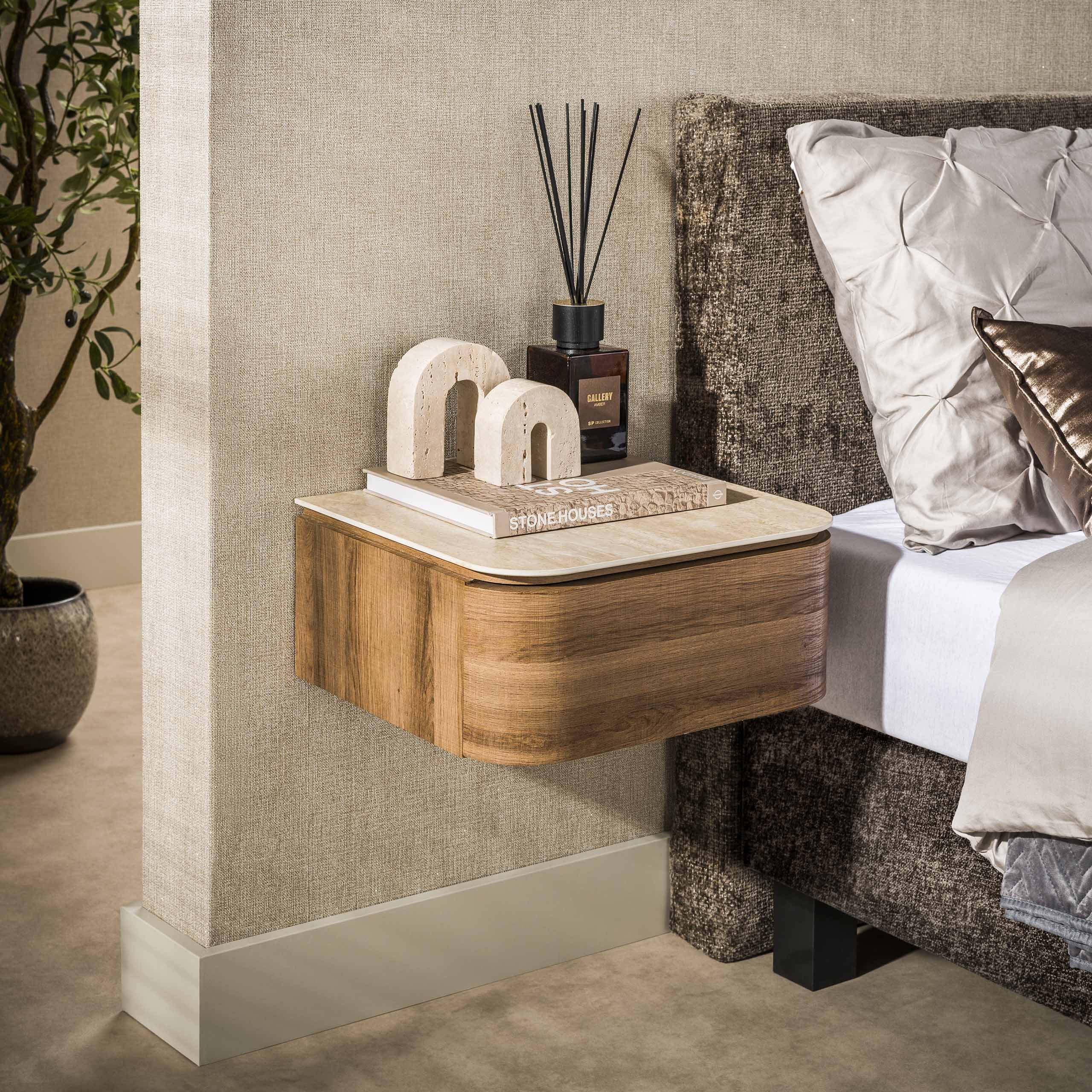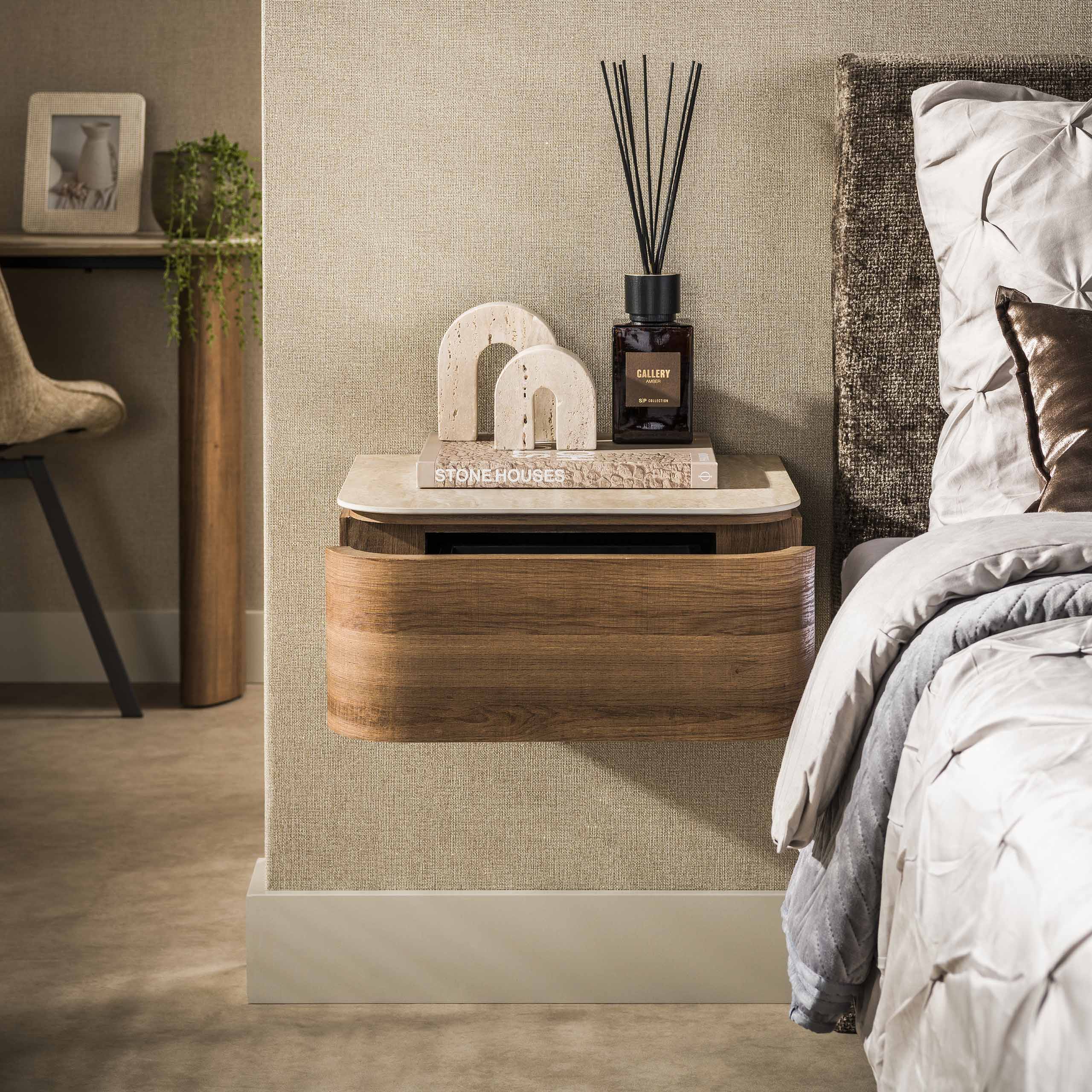 Zwevend nachtkastje met 1 lade keramiek travertin eikenhout Cady
